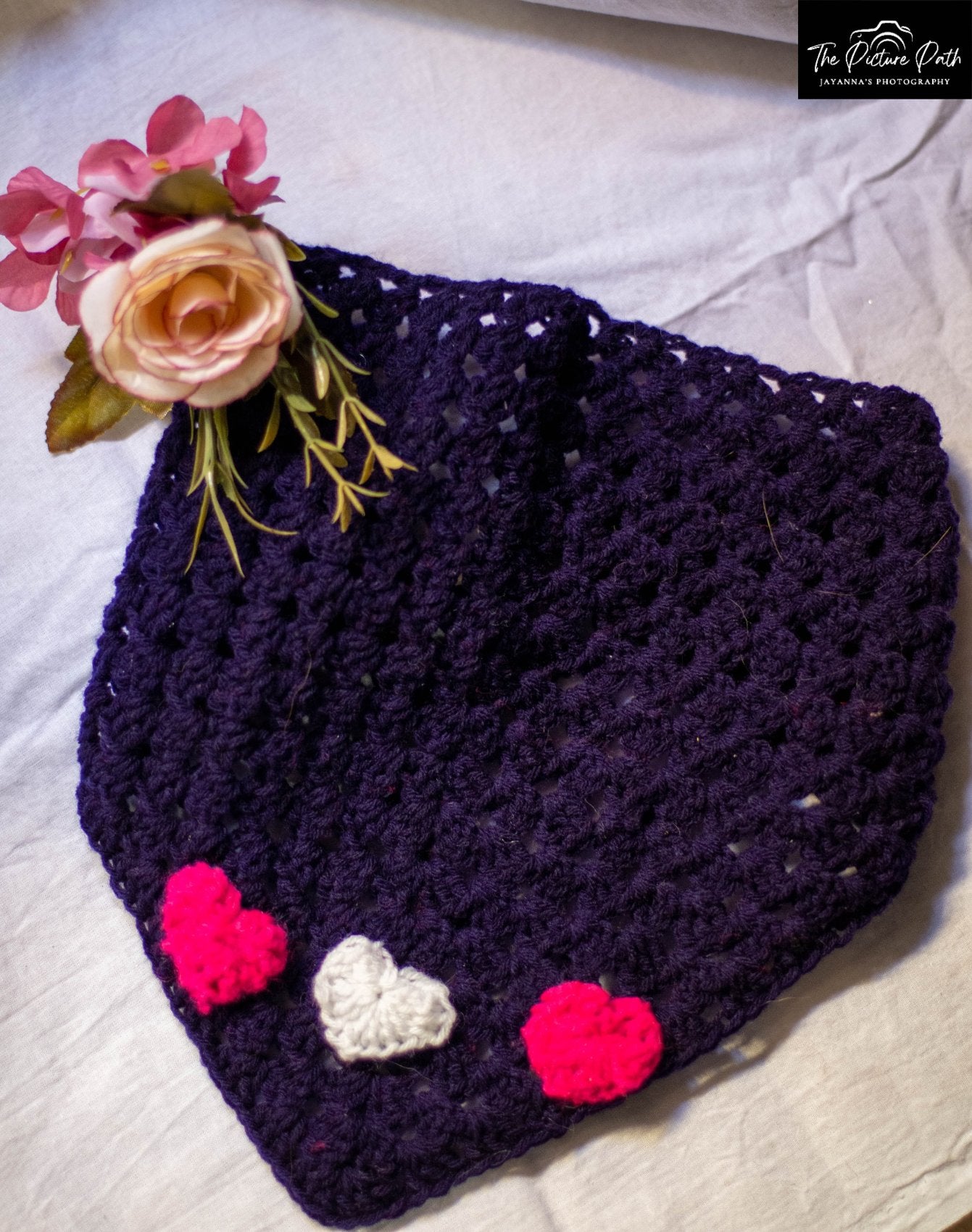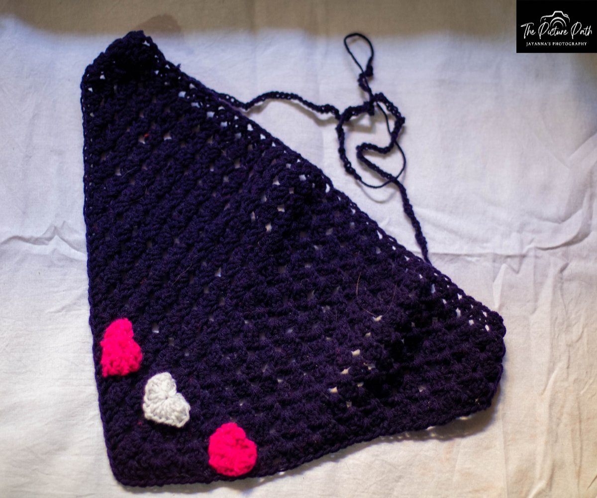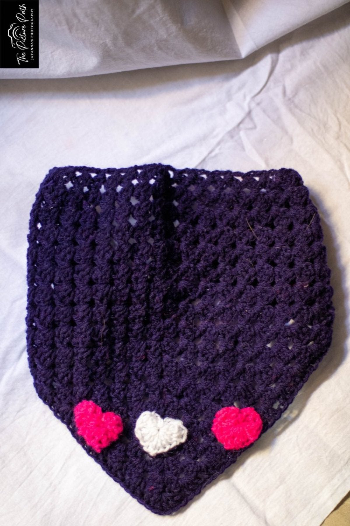 This a blue-colored bandana, made of wool. The product has three hearts on it and can be worn by dogs.