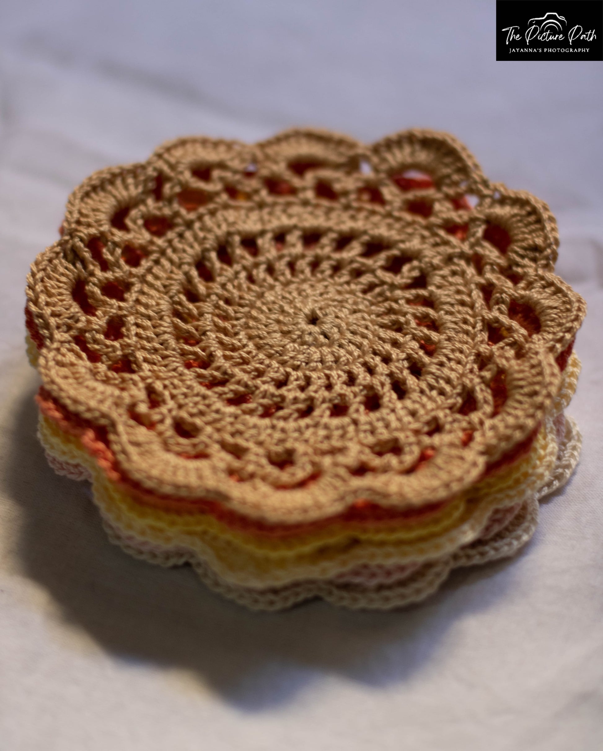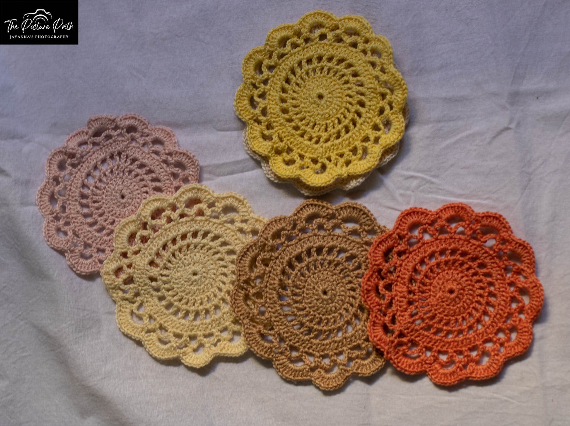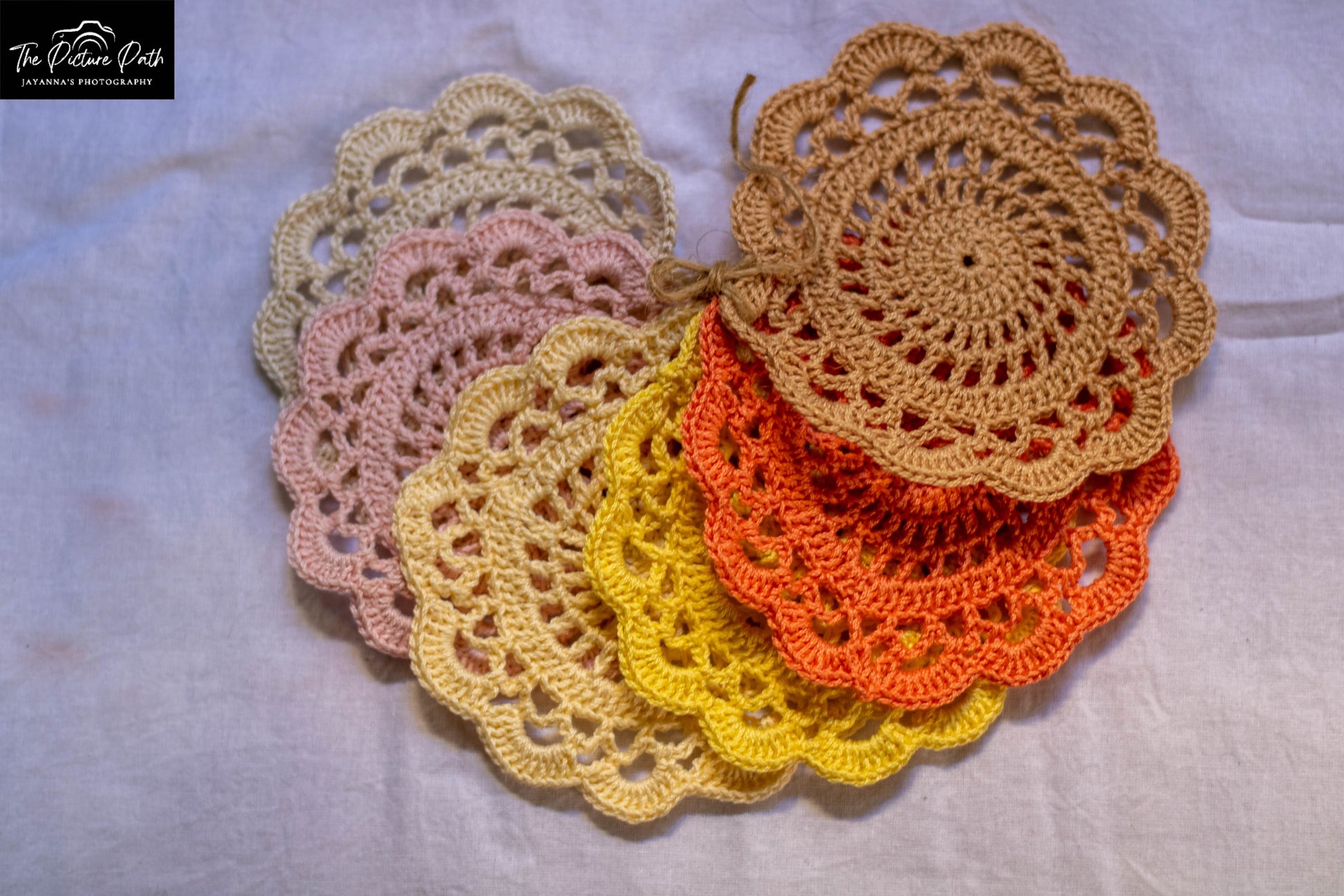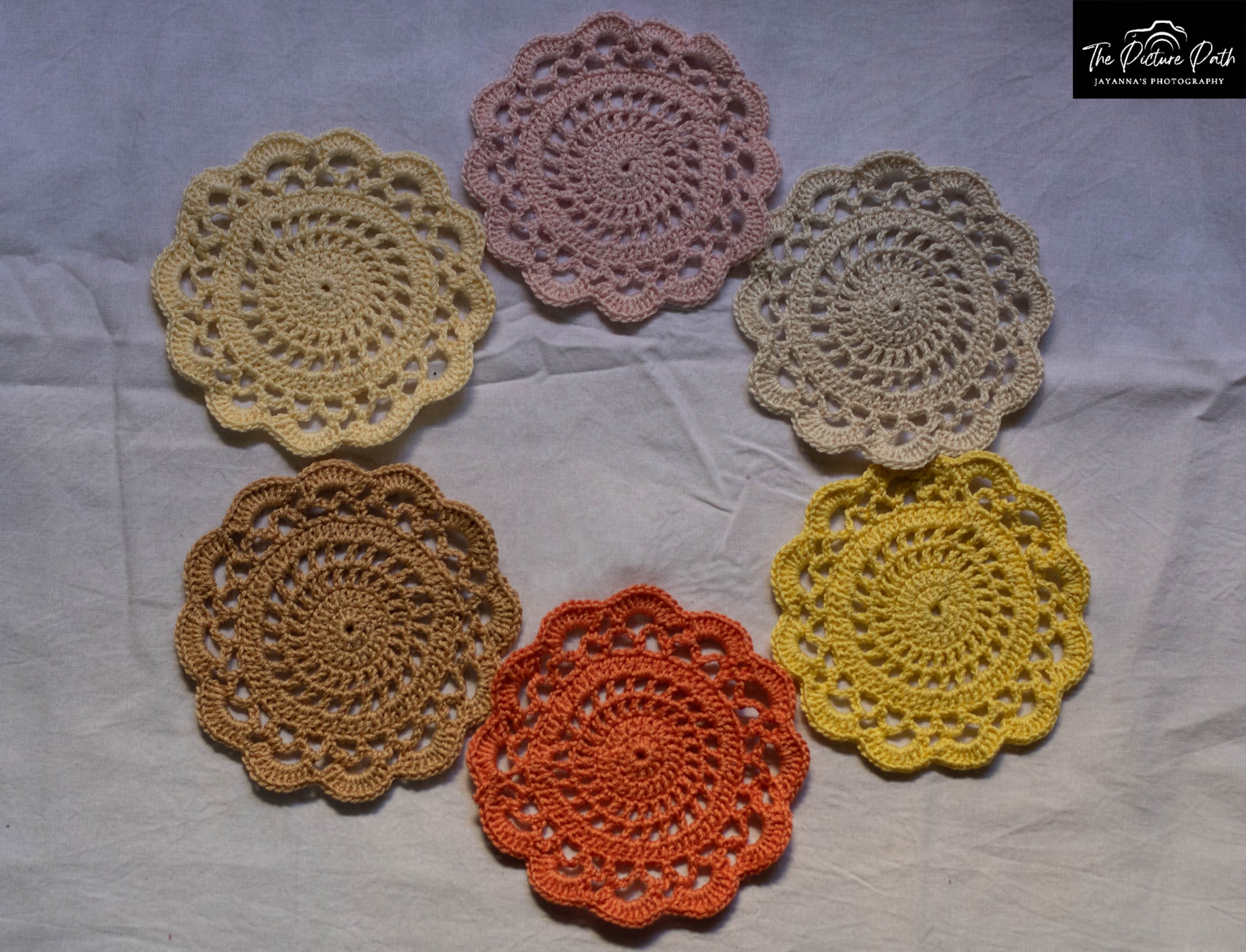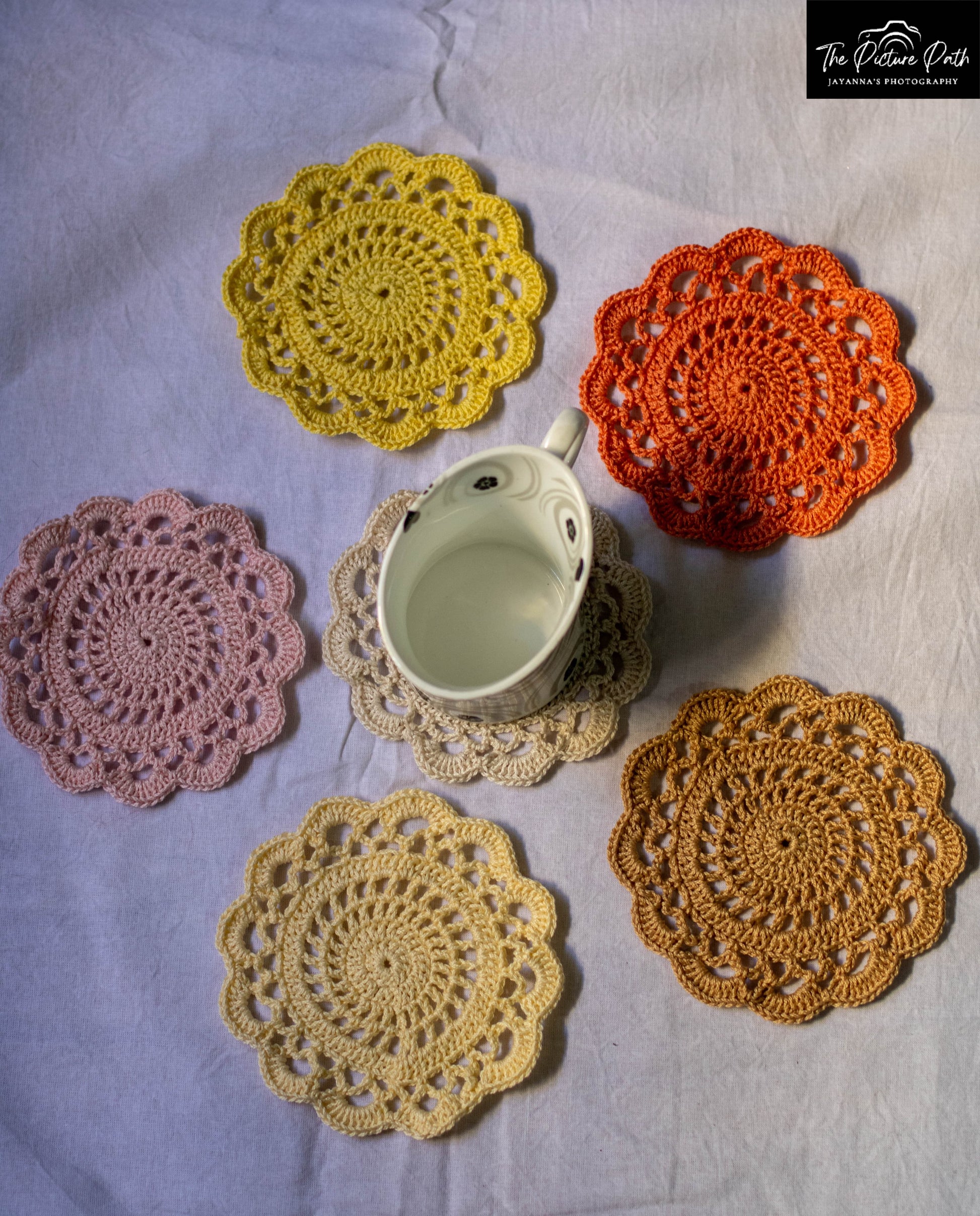 These are colorful flower Coasters, made of anchor treads and they come in a pack of six pieces.